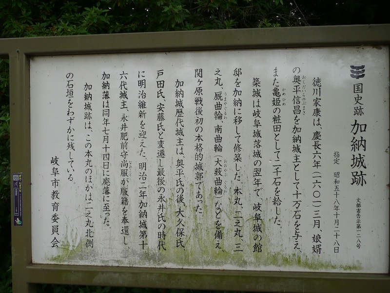岐阜駅から近そうだったし、岐阜城廃城後の経緯も気になり、ちょっと寄ってみました。近いとはいっても、知らない土地なので、徒歩20分は非常に長く感じられました・・・。途中、「加納城大手門跡」の石碑を街中で発見、そして加納城に到着すると、近所の小学生達が何やら野外活動を行っていました。その他にも、芝生でお弁当を食べているお子さん連れのファミリーや犬の散歩をしているおじさんなども。この光景はどこかで…。あっ!深大寺城だった!確かに、土塁と石垣の差こそあれども、「近所の広場」的な感じはとても似ています。ただ、虎口は明瞭に残っています。現地解説板を読み、ささっと写真を撮って、清洲城に向かいました。 |