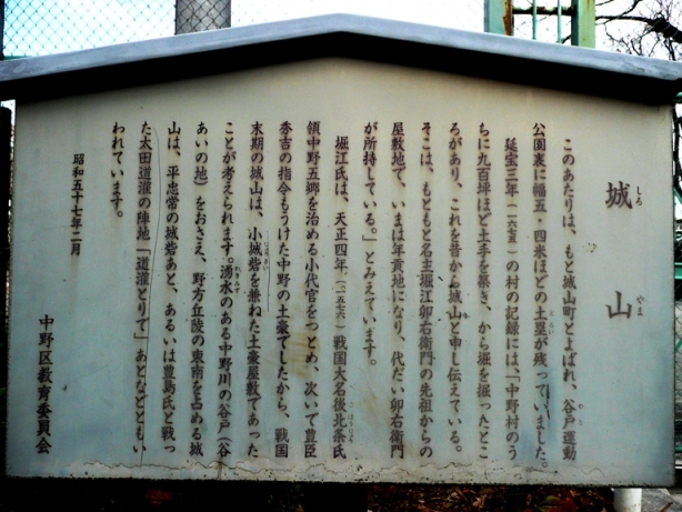 ただの公園です。昔、土塁があった場所には、「近代型の5層模擬天守(マンションのことやね)」が建っていました。周囲もざっと歩いてみたのですが、土塁の残骸すら見当たりませんでした。ここの裏にも「城山公園」という公園があり、そこも城域の一部だったのでしょうか。期待以上の「がっかり度」でしたが、中野に城があったなんてことを知る人は何人いるのでしょう。「都内・何も残ってないやんけ〜!」シリーズをやるのも面白いかもしれませんね。 解説板が一枚立っており、それによると、土豪の居館を城砦化したものであったようです。太田道灌の名前も出ていましたが、立地的に、石神井城・平塚城攻め時の陣城(豊島氏との沼袋・江古田の戦いに際して、太田道灌が改修を加え、前線基地の役割を果たした)か、或いは、屋敷を改修した岩槻城〜川越城の繋ぎの砦程度のものであったのかもしれませんが、比較的早い段階で廃城になっていたのではないかと推測します。 |