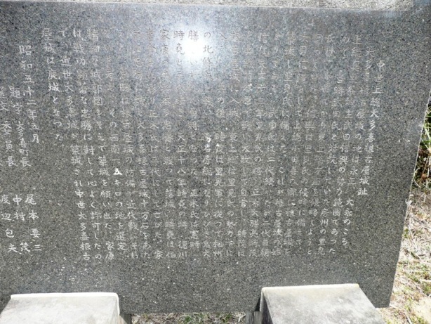 大多喜城の博物館で場所を尋ね、やっとの思いで辿り着きました。…が、見た限りでは宅地化が進み、「人工的な内堀」は見つけられませんでした。コンクリートで補強された丘の上に城址碑が建つのみ・・・。そこそこの規模はあったんでしょうが、近世大多喜城と比べると立地的にもかなり見劣りします。現状を見る限りでは「里見氏の上総侵略に備えた拠点」というようには思えませんでした。文字通り、根小屋地区の物見砦的な役割か、中世大多喜城(も現状の位置であるとするなら)の出城か・・・という感想でした。 |
