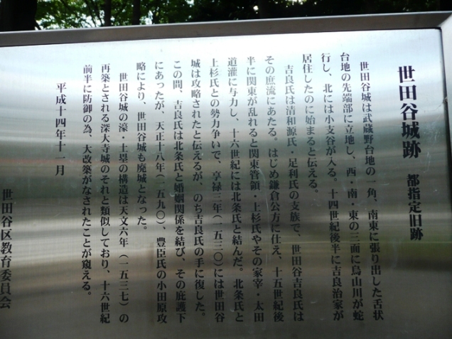 | 解 説 | 世田谷吉良氏の城館。世田谷吉良氏は三河国東条吉良氏の末裔で、治家の頃、上野国碓氷郡飽間郷を領し、「飽間殿」と呼ばれた。1366(貞治5)年、鎌倉公方足利基氏からから戦功として武蔵国世田谷郷を与えられ、この地に移り住んだと言われる。1426(応永33)年には、頼治か頼氏の代には世田谷に本拠を置いていた。 成高の代になると、戦国大名としての名実を備え、江戸城の太田道灌と同盟を結び、共闘。1477(文明9)年の長尾景春の乱では江戸城の防衛を任せられたが、その子頼康の代になり小田原北条氏と婚姻関係を結び、事実上北条氏に吸収される形となる。北条氏は世田谷新宿に六斎市を開き、世田谷城は南武蔵における軍事・交通の要衝となり、城下町も繁栄した。 天正18年の小田原攻めでは抵抗を示さず落城し、世田谷城の石材は江戸城修築の際に運び去られた。 |